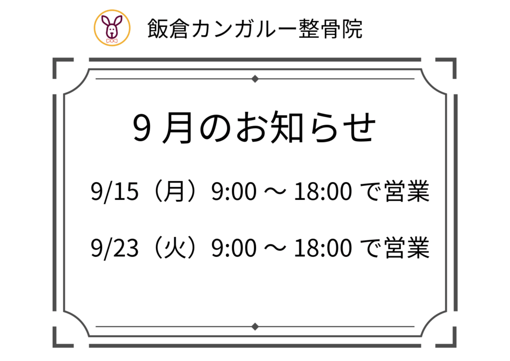 9月の案内 2025年9月1日 最終更新日時 : 2025年9月1日 kangaroo 9/15(月)→9:00~18:00で営業 9/23(火)→9:00~18:00で営業 飯倉カンガルー整骨院 〒814-0161 福岡市早良区飯倉6-22-27 TEL092-836-5884 Bluesky